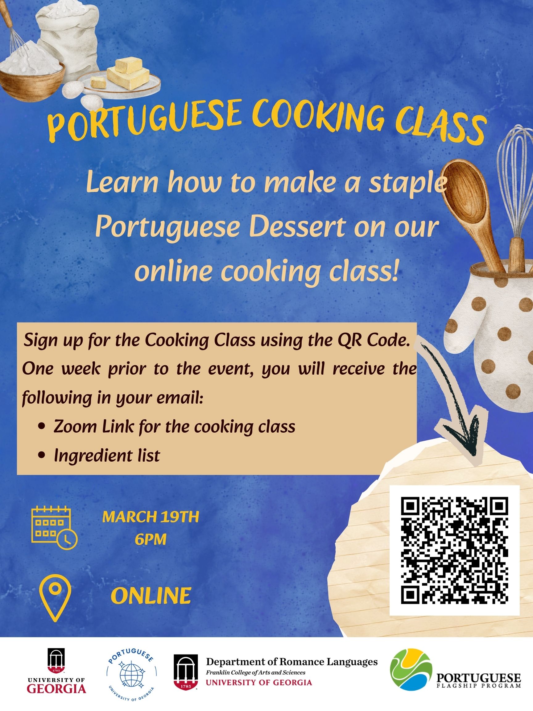 This event will be held online, March 19th, and starts at 6PM. For this event, we ask that you register prior using the QR code on the flyer. You will receive an email with both the Zoom link and ingredient list some days prior to the event.