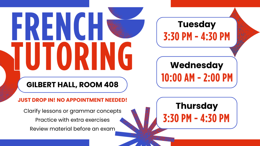 The Department of Romance Languages offers free language tutoring for current students in French, Italian, Portuguese, and Spanish. New for Spring 2026, we’ve added French conversational practice sessions.