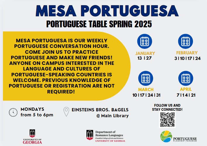 "The Portuguese Table is not only a place to go to improve your Portuguese, but it is also a place to make friends and learn about the many activities organized by Brazilian students on campus. Conversation is casual, but we also have games and activities to prompt conversation. The Portuguese table is also a nice place to get tips about places in Georgia where you can experience a little bit of Brazilian culture and food. We are always around and willing to meet new people." - Daniel